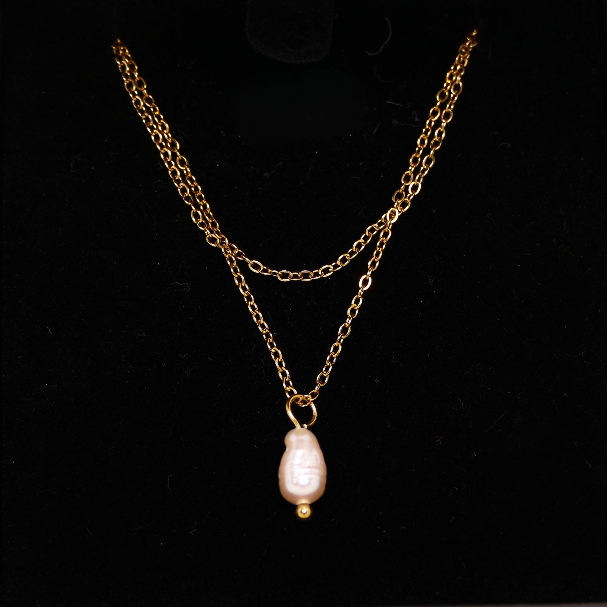 Die Duo Perlen Kette vereint zarte Eleganz mit modernem Design. Zwei feine Edelstahlketten in hochwertiger Vergoldung bilden eine harmonische Einheit und setzen die schimmernde Frischwasserperle mit ca. 7 mm Größe perfekt in Szene. Der warme Goldton betont den sanften Glanz der Perle und macht die Kette zu einem vielseitigen Schmuckstück – ideal für Alltag und besondere Anlässe.